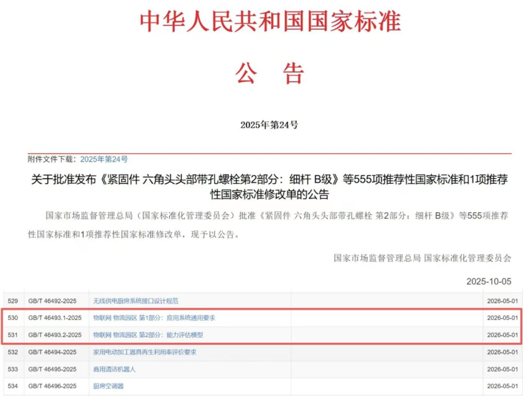 近日,国家市场监督管理总局(国家标准化管理委员会)发布中华人民共和国国家标准公告(2025年第24号),其中,由中国物流与采购联合会、中国电子标准化技术研究院、湖北商贸物流集团有限公司等单位共同起草的《物联网 物流园区 第1部分:应用系统通用要求》《物联网 物流园区 第2部分:能力评估模型》国家标准正式获批,该2项标准于2025年10月5日发布,并将于2026年5月1日实施。