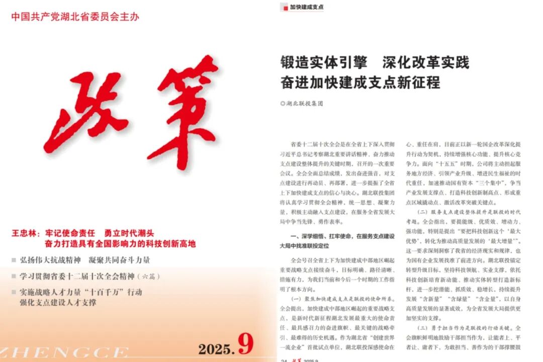 近日,中国共产党湖北省委员会主办刊物《政策》2025年第9期刊发了《锻造实体引擎 深化改革实践 湖北918博天堂奋进加快建成支点新征程》,以下为全文内容: